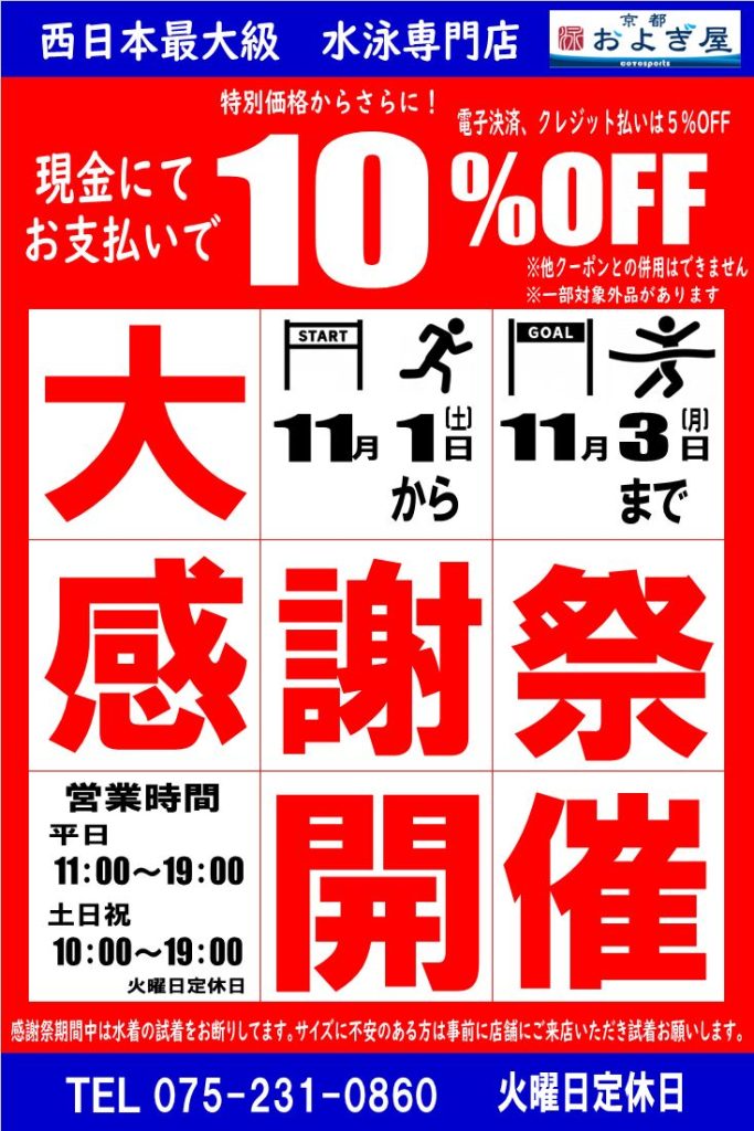 NEWS 2025年10月24日 およぎ屋大感謝祭告知 11月1日~11月3日まで、大感謝祭を行ないます。 およぎ屋公式ラインの友達ご登録様限定 現金支払い:10%OFF その他支払い方法は5%OFF になります。 ※返品交換不可です。 ※期間中試着は出来ませんのでご了承ください およぎ屋・ばれー屋 TEL:075-221-6366 営業時間:平日/AM11:00~PM7:00 土日祝/AM10:00~PM7:00 定 休 日:毎週火曜日