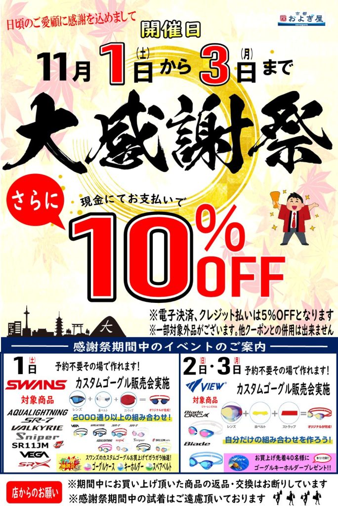 NEWS 2025年10月29日 およぎ屋感謝祭追加情報 自分の好きなパーツの色を選べて、自分オリジナルの ゴーグルが作れちゃう!!カスタムゴーグルを実施します。 1日:SWANS 2日、3日:view カスタムゴーグルを購入すると、外れなしのガチャガチャが回せます!! およぎ屋・ばれー屋 TEL:075-221-6366 営業時間:平日/AM11:00~PM7:00 土日祝/AM10:00~PM7:00 定 休 日:毎週火曜日