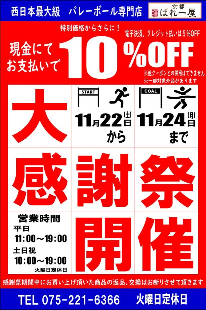 NEWS バレー屋 2025年11月15日 ばれー屋大感謝祭予告! ばれー屋感謝祭を11月22日~11月24日に行います ラインお友達限定になっており、クーポン提示で 現金支払いで10%off その他支払いで5%off になります。 実は今年はばれー屋が10周年!!なので、 ちょっとしたプレゼントも用意しています(数量限定) 詳細はまた後日ラインでお伝えしますので友達登録をお願いします。 およぎ屋・ばれー屋 TEL:075-221-6366 営業時間:平日/AM11:00~PM7:00 土日祝/AM10:00~PM7:00 定 休 日:毎週火曜日